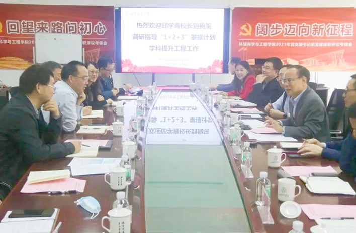 生态文明建设和“双碳”目标是国家战略和区域产业需求。2018年,我校环境生态工程研究院应运而生,在此基础上,学校又成立了生态环境与资源学院。在杨志峰院士的带领下,研究院/学院在短短三年半的时间里实现了从无到有、从小到大、从弱到强,建设成果喜人。4月11日下午,邱学青来到生态环境与资源学院,他用“活力足、势头好、冲劲强”充分肯定了学院所取得的成绩,并充满感情地说:“每次到学院都被这里的朝气和氛围所感染。” 希望学院发挥院士领军的优势,把握好国家发展的重要战略机遇,深度挖掘学科优势,积极引入政府资源和企业资源,做好布局,做出特色,提高科研成果彰显度,攀登学科高峰。