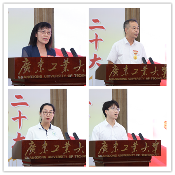 获奖教师代表刘旭红教授表示,获得学校首届“教书育人奖”,感到十分光荣,作为平凡的教师,所做的就是坚持一颗爱生如子的心,用真情相待学生们,37年来培养的学生有全国劳动模范、建筑公司党委书记、董事长、教授级高工等,今后继续在平凡的岗位上坚守,在坚守中奋力前行,做党和人民教育事业的奉献者。“忠诚服务奖”获奖者、揭阳校区吴黎明教授说,最骄傲的是40年亲身经历了广工大扩规模、拓空间、上水平、攀高峰,最高兴的是培养了一批又一批听党话、跟党走、有理想、有本领、具有为国奉献钢筋铁骨的高素质人才,将不忘初心、牢记使命、继续奋斗,用自己的实际行动做学生为学、为事、为人的示范。