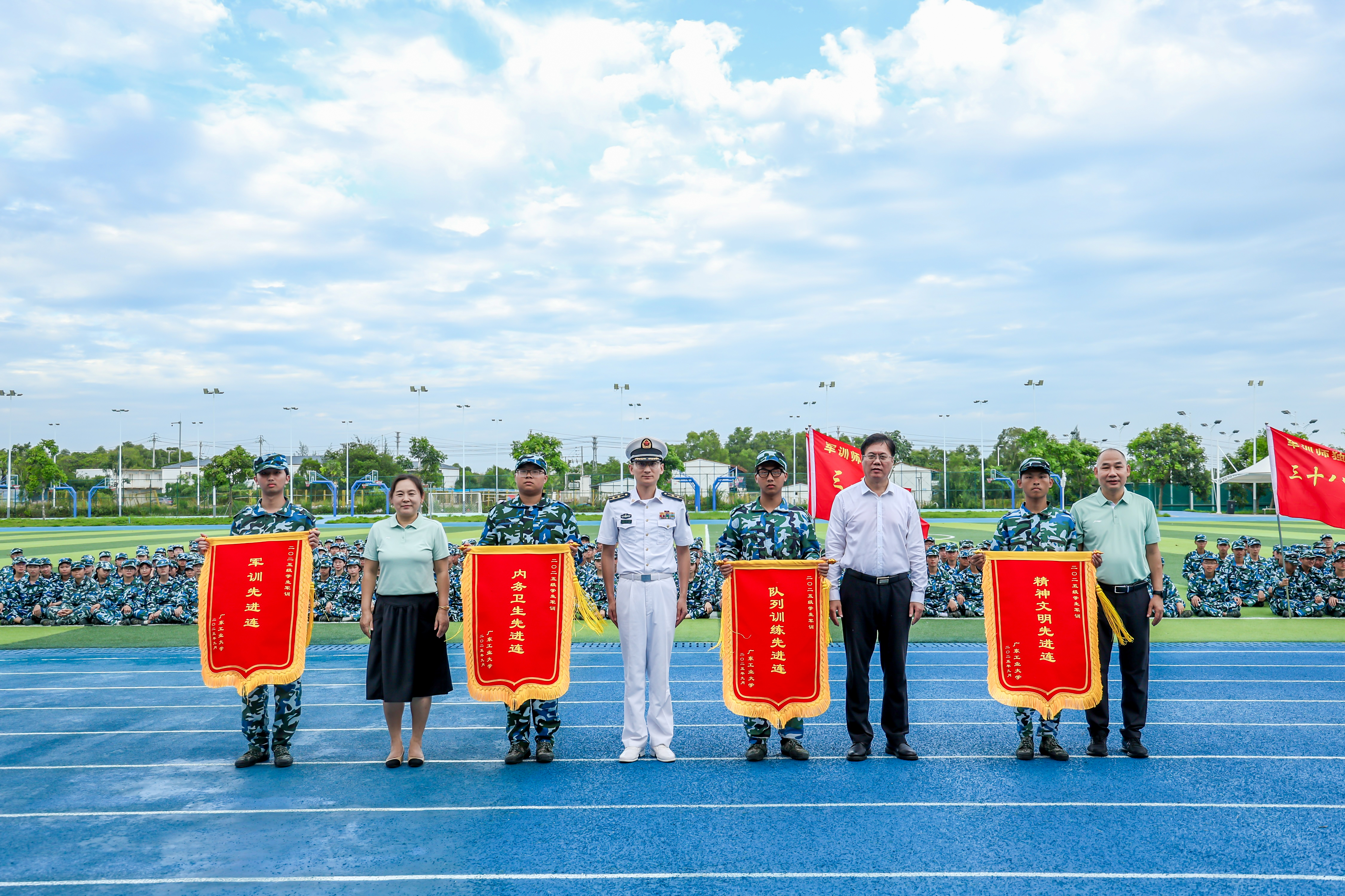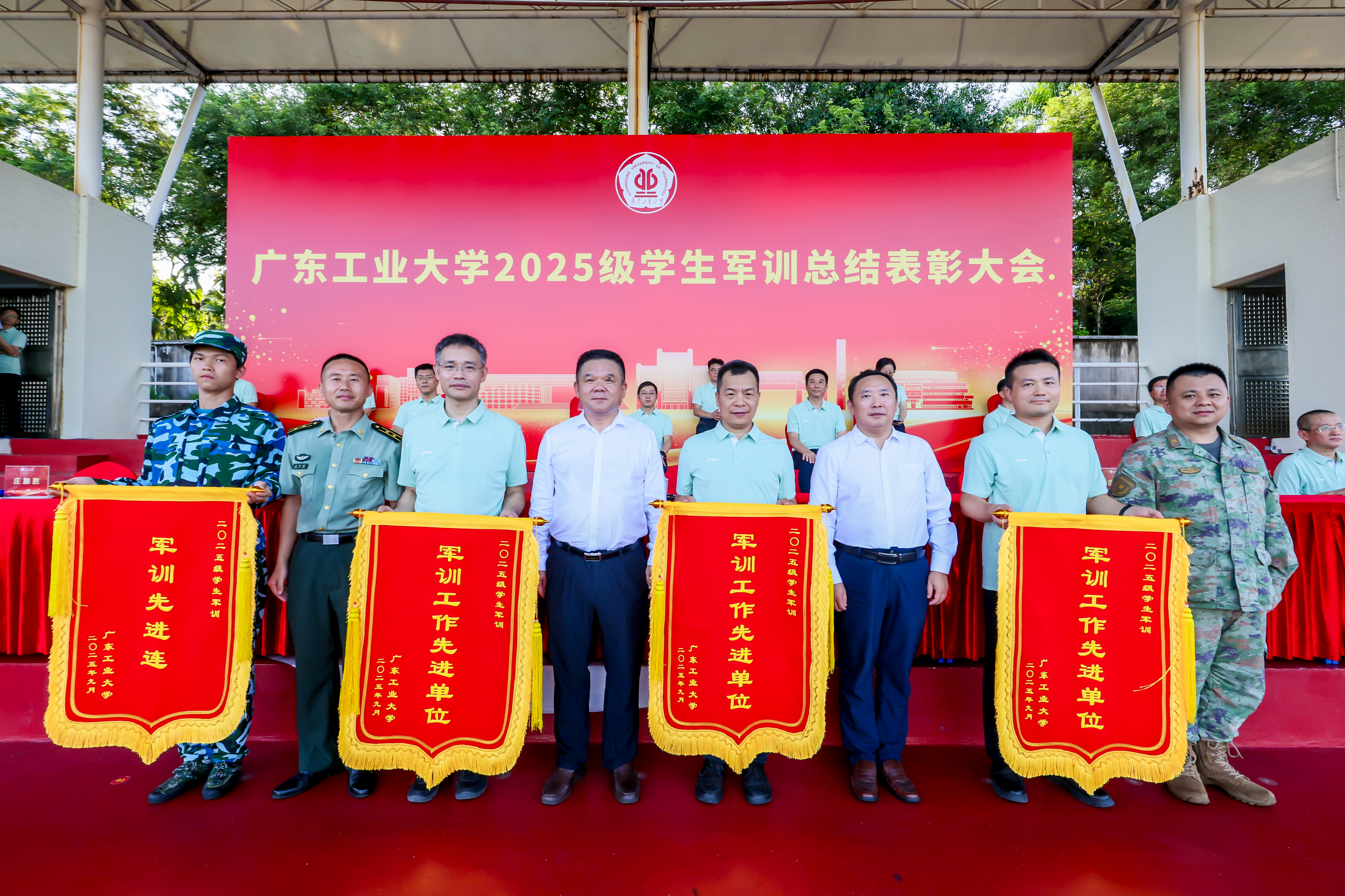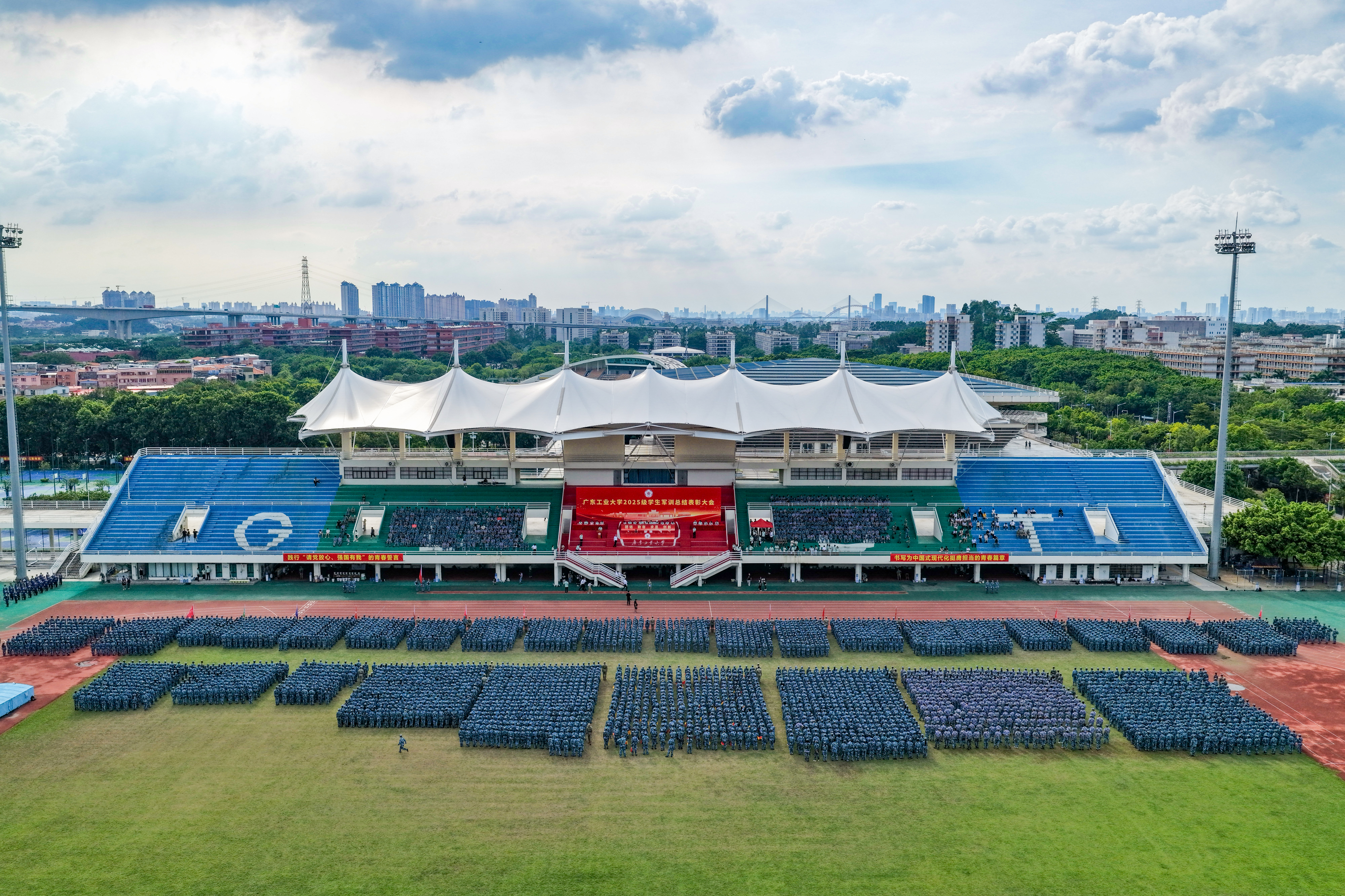 9月26日下午,广工2025级学生军训总结暨表彰大会在大学城校区、龙洞校区和揭阳校区举行,东风路校区同学在龙洞校区参会,番禺校区同学在大学城校区参会。14天的汗水与拼搏,一万余名新生实现蜕变,用最饱满的风貌交上了一份完美的青春答卷。