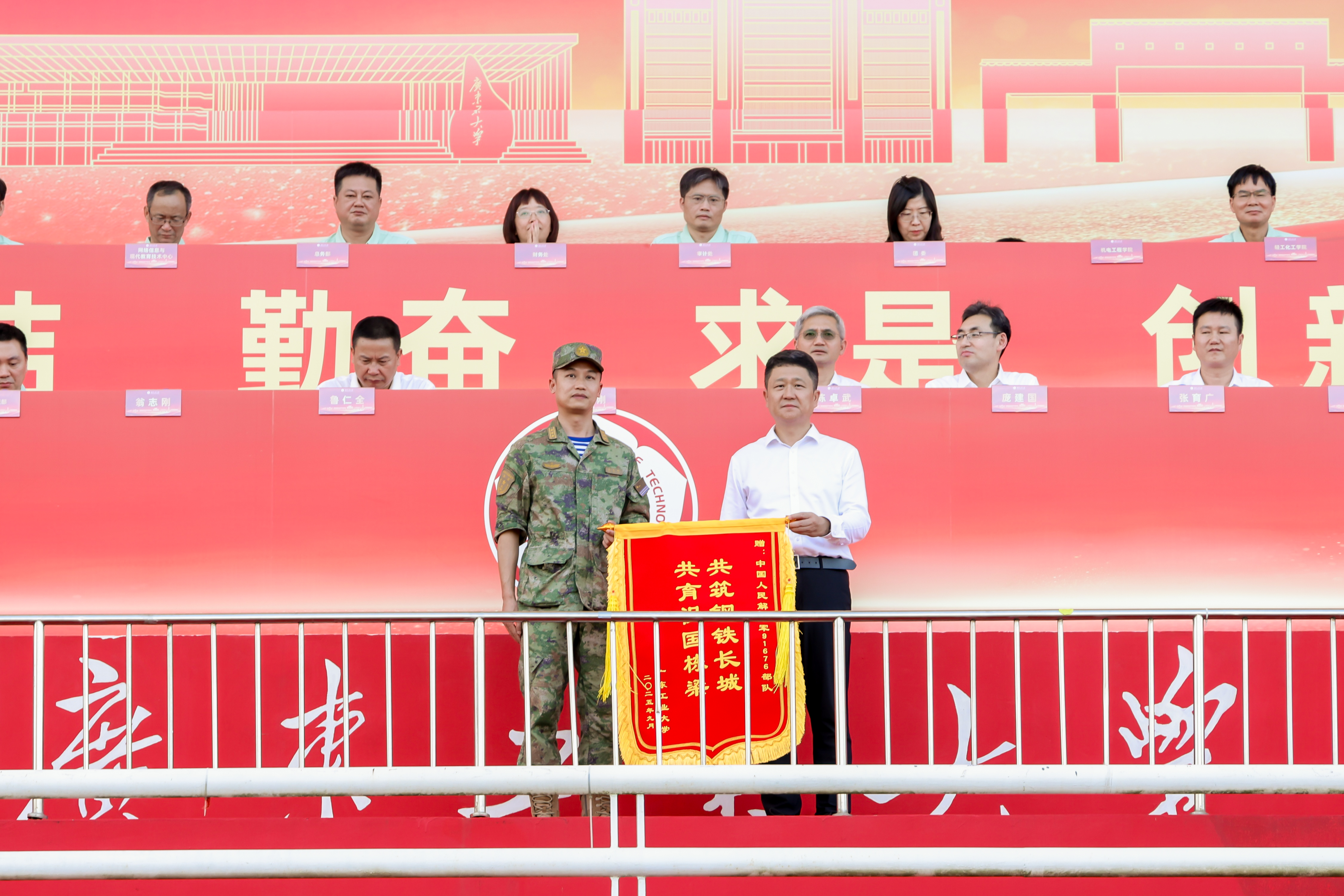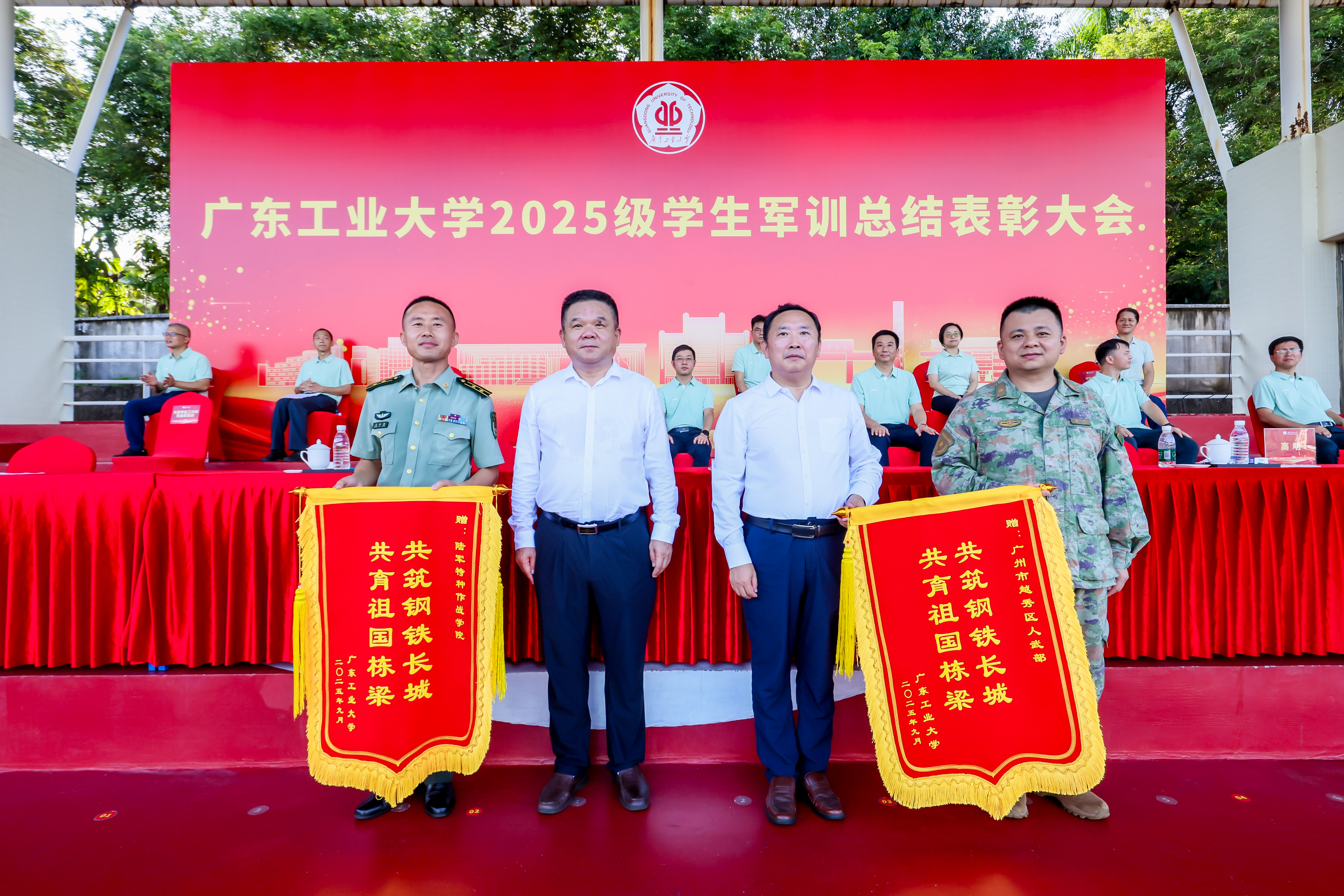 杜承铭、王振友分别在龙洞校区、揭阳校区讲话。陈卓武、余林、揭阳校区负责人分别宣读《leyu乐鱼·官方web站登录入口表彰2025级学生军训先进集体和先进个人的决定》,校领导和承训单位领导为获奖集体和个人代表颁奖。白建刚、杜承铭、王振友、余林向承担本次军训任务的陆军特种作战学院、中国人民解放军91676部队、中国人民解放军92822部队、广州市越秀区人民武装部赠送锦旗。