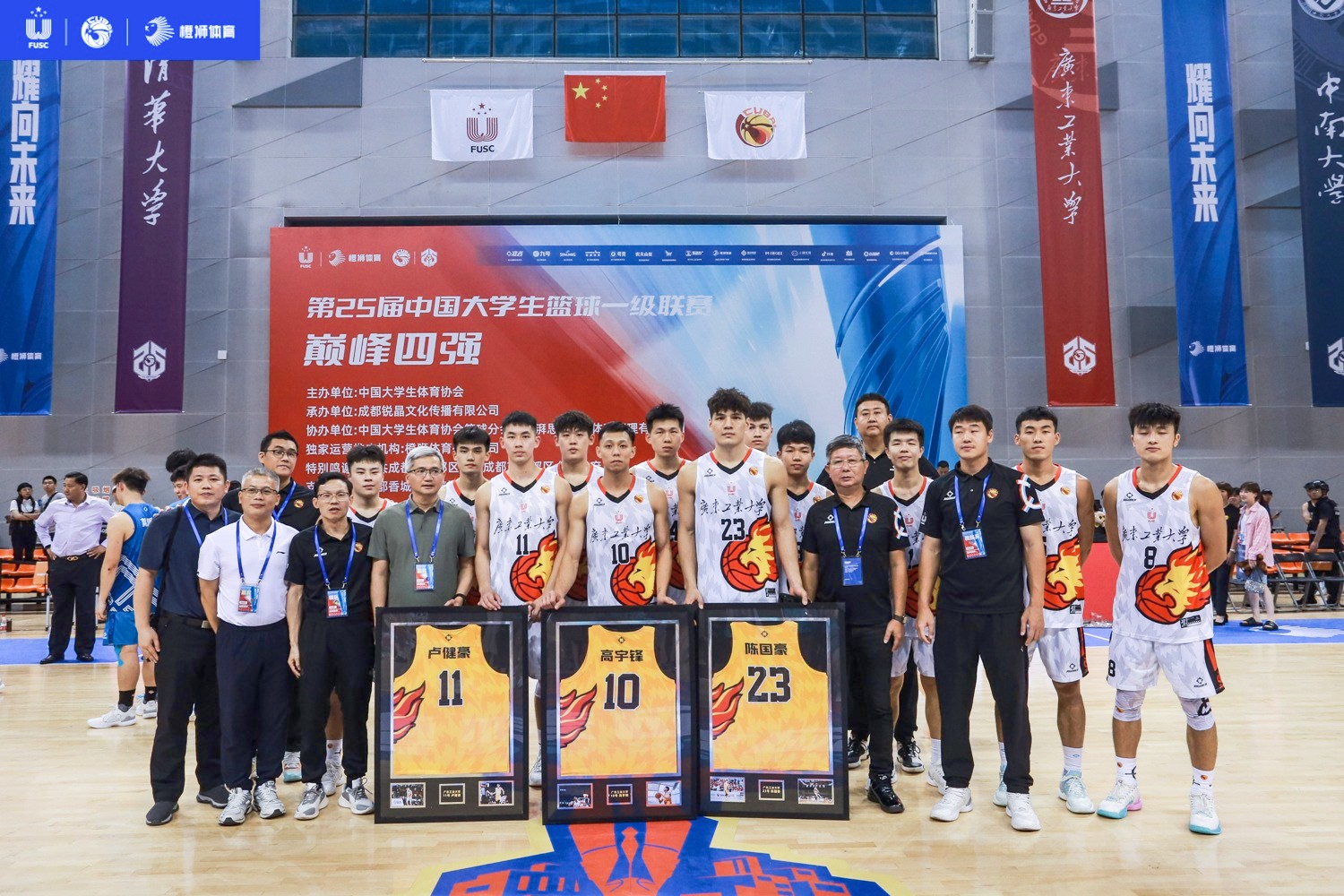 当天还举行了退役仪式,广工高宇锋、卢健豪、陈国豪分别领到赛会颁发的leyu乐鱼·官方web站登录入口10号、11号、23号球衣作为参赛纪念。