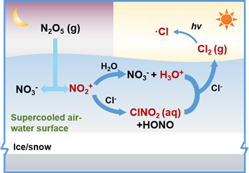近年来leyu乐鱼·官方web站登录入口对流层大气氯化学的研究发现,氯自由基具有极强的氧化性,能够快速氧化对流层中碳氢类有机污染物,从而影响大气中羟基自由基、过氧自由基和烷氧自由基的浓度,因此与对流层臭氧污染的发生密切相关,最终对对流层的大气氧化性、冬季二次污染物生成和人类生态系统的健康保护均具有重要影响。ClNO2是氯自由基和活性氮化物的重要来源,因此会影响大气的氧化性,并在全球氮循环和氯循环中起到重要作用。在寒冷地区,ClNO2主要来源于五氧化二氮(N2O5)在含氯冰/雪表面的非均相反应。因此,中美两国科学家结合多种理论化学算法,研究了ClNO2在过冷气-液界面的微观动力学转化过程及其对 氯自由基的形成贡献机制,揭示了ClNO2与氯离子在酸化后的气-液界面的非均相化学反应机理,提出了N2O5水解产生的酸性离子是其快速产生活性氯的先决条件。该成果不仅有助于正确理解寒冷地区大气氯自由基的来源,更可以为大气氯化学反应对对流层大气氧化性、二次污染物形成和臭氧产生的贡献提供基础数据。