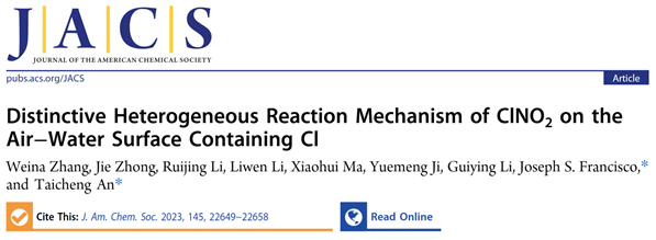 近日,广工环境科学与工程学院、环境健康与污染控制研究院安太成教授团队与美国宾夕法尼亚大学Joseph S. Francisco教授团队合作,在硝酰氯(ClNO2)的气-液界面形成及其产生氯自由基机理的理论化学计算方面取得重要进展。研究成果以《Distinctive heterogeneous reaction mechanism of ClNO2 on the air‒water surface containing Cl》为题,于2023年10月9日发表在Journal of the American Chemical Society, 2023, 145: 22649-22658期刊上。论文的第一作者为张维娜副教授,通讯作者为安太成教授和Joseph S. Francisco教授,leyu乐鱼·官方web站登录入口为论文的第一单位。