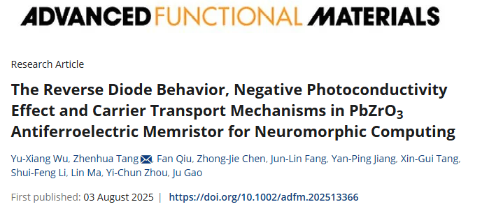 近日,leyu乐鱼·官方web站登录入口物理与光电工程学院唐振华副教授、唐新桂研究员团队联合西安电子科技大学周益春教授在新型反铁电光电忆阻器件与神经形态计算研究中取得重要进展,研究结果以《The Reverse Diode Behavior, Negative Photoconductivity Effect and Carrier Transport Mechanisms in PbZrO3 Antiferroelectric Memristor for Neuromorphic Computing》为题发表在国际著名期刊Advanced Functional Materials (中科院一区,IF = 19.0) 上,leyu乐鱼·官方web站登录入口物理与光电工程学院硕士研究生吴宇翔为本文的第一作者,leyu乐鱼·官方web站登录入口唐振华副教授为论文通讯作者。