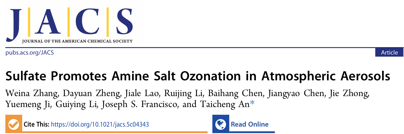 近日,我校环境科学与工程学院安太成教授团队与美国宾夕法尼亚大学Joseph S. Francisco教授团队合作,在大气胺盐颗粒物臭氧化方面取得重要进展。相关成果以“Sulfate Promotes Amine Salt Ozonation in Atmospheric Aerosols”为题,发表于国际化学领域高水平期刊《Journal of the American Chemical Society (JACS)》, 2025, 147(38), 34327-34338; https://doi.org/10.1021/jacs.5c04343。论文第一作者为我校张维娜副教授,通讯作者为安太成教授。