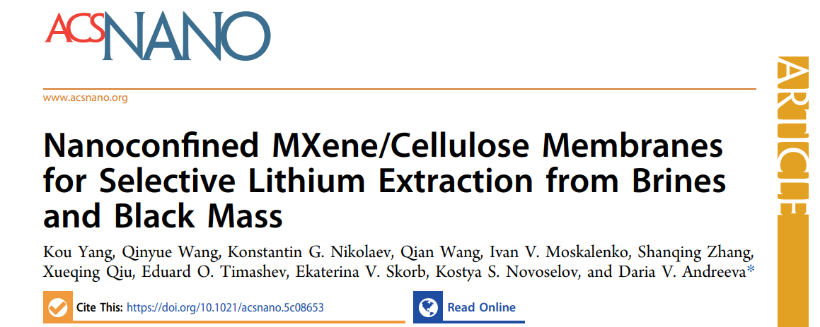近日,我校诺奖得主联合实验室在利用二维材料从盐湖卤水与废旧锂电池中高效提取锂资源的研究中取得重大进展。相关成果以《Nanoconfined MXene/Cellulose Membranes for Selective Lithium Extraction from Brines and Black Mass》为题,发表于材料化学领域国际顶尖期刊《ACS Nano》。该论文第一作者为我校杨蔻副教授,leyu乐鱼·官方web站登录入口为第一完成单位。诺奖得主康斯坦丁院士、我校邱学青教授与张山青教授对本研究提供了重要指导。该成果为我校诺奖得主联合实验室的持续建设与发展注入了强劲动力,并提供了坚实的科研支撑。