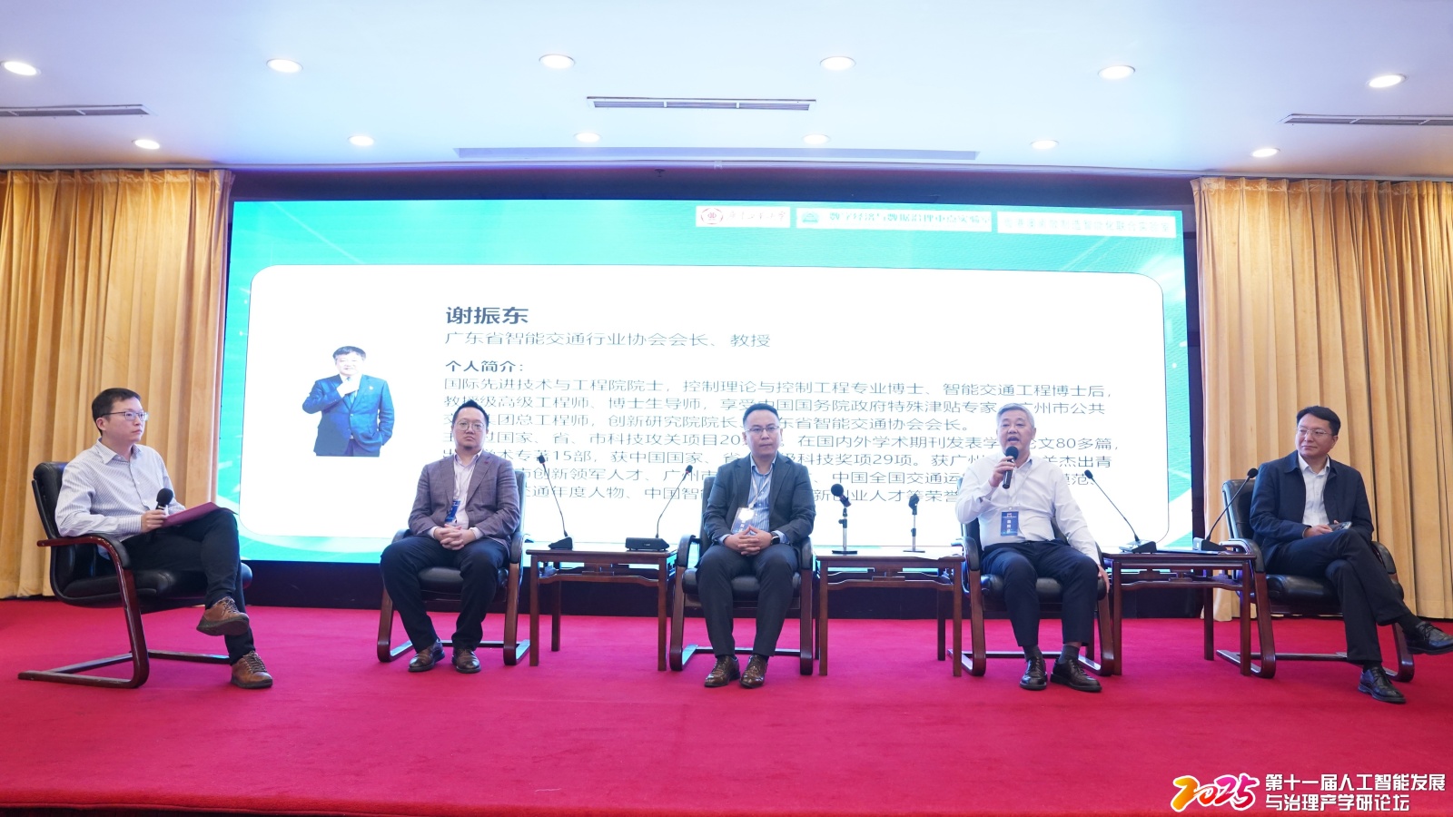 圆桌论坛环节以“AI的实践探索与现实瓶颈”为主题展开讨论。广东省智能交通行业协会会长谢振东、粤港澳大湾区人工智能与自动化学会理事长谢侃、广东省数字经济学会常务副会长朱金周、广东省制造业协会人工智能与机器人专委会执行秘书长查祥等就人工智能在智能交通、制造业、服务业等领域的落地应用与面临挑战进行了深度对话。